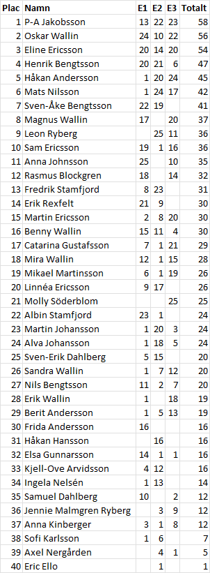 Totalställningen Totalt efter 3 av 9 deltävlingar.Arrangörer erhåller 20 poäng på den etapp de arrangerar.